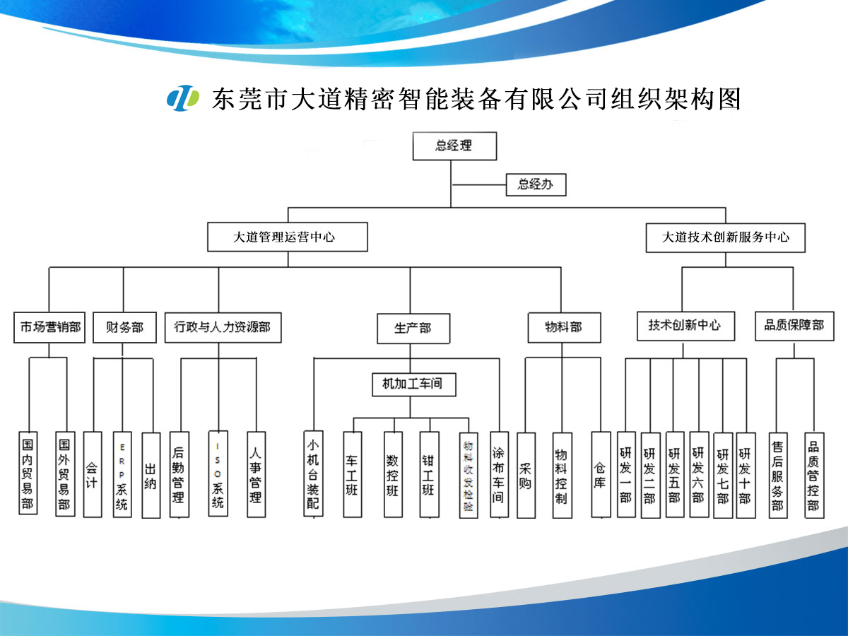 大道精密成立于2019年,公司注冊(cè)資本1000萬(wàn)元,擁有辦公室、廠房等18,000多平方米。已通過(guò)ISO9001:2015國(guó)際質(zhì)量管理體系認(rèn)證,擁有國(guó)家各類(lèi)專(zhuān)利共計(jì)58項(xiàng),獲得“中國(guó)大道.商標(biāo)”和“一帶一路十周年 .國(guó)禮品牌”等榮譽(yù)稱(chēng)號(hào),屬于國(guó)家高新技術(shù)企業(yè),專(zhuān)精特新中小企業(yè)。2023年4月成立了“東莞市大道精密智能裝備有限公司關(guān)心下一代工作委員會(huì)”,是東莞市企石鎮(zhèn)工商聯(lián)副會(huì)長(zhǎng)單位、東莞市企石鎮(zhèn)文學(xué)藝術(shù)界聯(lián)合會(huì)副主席單位、東莞市環(huán)保包裝行業(yè)協(xié)會(huì)副會(huì)長(zhǎng)單位、東莞市數(shù)控裝備行業(yè)協(xié)會(huì)第二屆會(huì)長(zhǎng)單位、廣東省包裝技術(shù)協(xié)會(huì)常務(wù)理事單位、廣東省膠粘劑行業(yè)協(xié)會(huì)理事單位、國(guó)家標(biāo)準(zhǔn)《機(jī)械安全中安全防護(hù)授權(quán)系統(tǒng)的基本要求》起草單位。